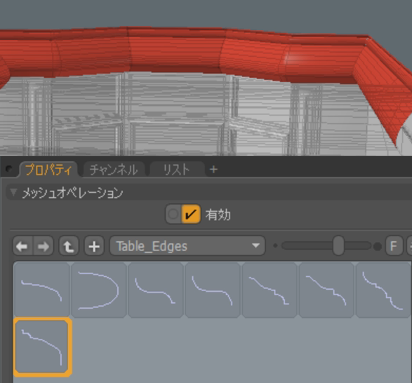 サンプルシーンで屋根付近にポリゴンを作成し、それを別のメッシュレイヤーへと移します。このポリゴンの輪郭に沿ってポリラインを抽出します。メッシュオペレーションのタブへと移りアイテム追加エッジEdges to Curvesを追加します。これがエッジをカーブへ変換するオペレーションです。今回はカーブタイプとしてポリラインを選択しますが、他のカーブタイプを指定することも可能です。