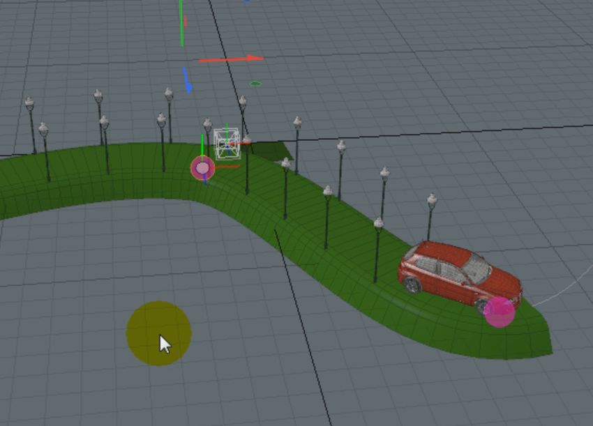 ではさらに、車の動きに従って街灯を立てていくアニメーションも設定します。街灯はリプリケータを使って作っていきますが、10.1では動的にメッシュの形状を変えるだけでなく、カーブを利用したポイントソースも変化させることができます。