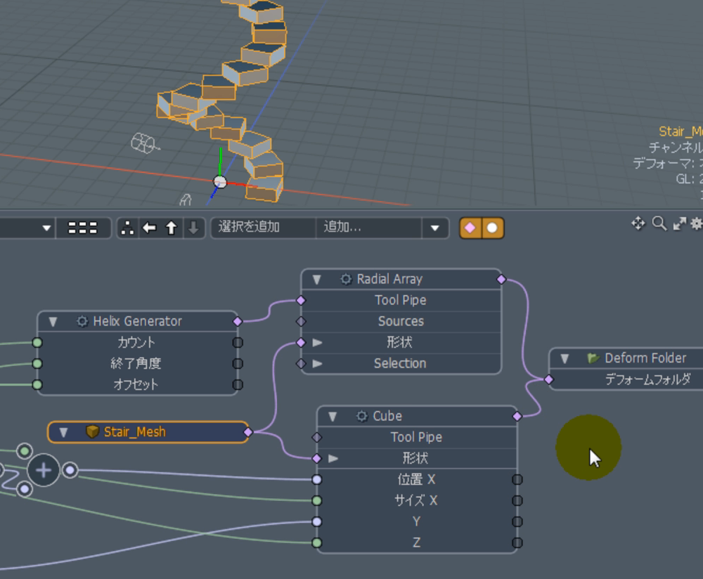 このCountはRadial ArrayHelix Generatorカウント、Heightはオフセット、Angleは終了角度、Size XとSize ZはCubeのサイズ Xサイズ Zに接続します。これらにプロパティよりコントロールされるのがCubeのY軸に対するサイズとCubeのX軸に対する位置ですので、それらのチャンネルを追加しておきます。