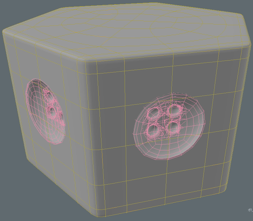 まずはMeshFusionで簡単なボタンのような形状を作ってみましょう。QBicジオメトリから一つメッシュを読み込み、別のメッシュレイヤーに組み合わせるかざりのメッシュを作ります。メッシュオペレーションから複製 > Arrayを使って2×2に配置します。そうしたらQBicメッシュをプライマリに、かざり用のメッシュをプライマリへと設定します。そうすると、プロシージャルモデリングを使って複製されたメッシュで、キレイに組み合わされるようになりました。かざりはプロシージャルモデリングの配列で設定していますので、後から変更していくことも可能です。
