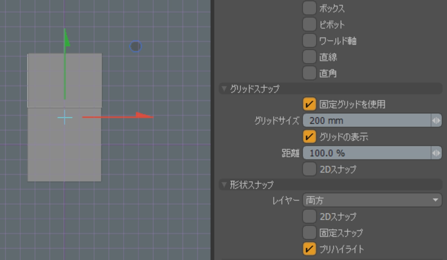 優先面のバイアスはデフォルトでは動的に設定されており、これが旧来までの動作と同じです。ビューポートをズームイン・ズームアウトするたびにグリッドのサイズは変更されます。しかしこれを固定に変更し、グリッドのサイズを指定すると、いくらズームイン・ズームアウトしてもグリッドの大きさは変わることがありません。場合によっては、こちらの方が使いやすい場合もあるかと思います。