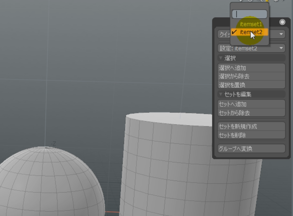 この選択セットは頂点・エッジ・ポリゴンといったコンポーネントモードだけでなく、アイテムに対しても同様に操作することができますので、まとめて選択したいアイテム群をすぐに選択することも可能です。