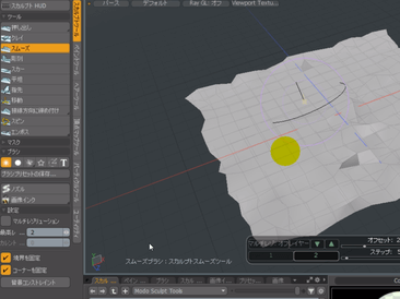 まずはモデリングにおけるスムーズツールを見ていきましょう。モデルパレット > 変形タブにあるスムーズツールを起動し、こういった開いた凸凹したメッシュに対して適用してみると、デフォルトの状態で四隅が固定されたままスムーズがかけられます。プロパティを見てみると、コーナーを固定および境界を固定というオプションが用意されており、デフォルトではコーナーを固定オプションがオンになっています。境界を固定オプションをオンにしてスムーズをかけてみると、輪郭部分は全て固定された状態で、中のセグメント部分だけにスムーズがかけられるようになります。