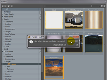 マテリアルやアイテム、シーン、画像、環境、プロファイル、スクリプトなど、世界中のMODOユーザーがここにアセットをアップロードしては共有できるシステムが以前から構築されています。このアセットシェアのサイトのアセット、例えば画像を利用しようとすると、まずサイト上でダウンロードし、それを自分の環境に配置する必要がありました。