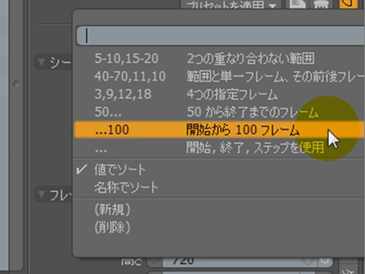 このように様々なパターンでフレーム範囲を指定することができるようになりますが、このフレーム範囲の指定方法は入力フィールド右にある三角ボタンを押すと、プリセットで選択できるようになっていますので、レンダリングしたいフレーム範囲の指定方法に近いプリセットを選択した上で書き換えると、簡単に設定することができます。