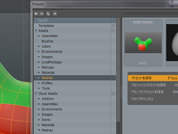 さらにプリセットパネルには、自分で作ったメッシュを登録することができますが、この登録も非常に簡単に行えるようになりました。従来まではファイルメニュー > アイテムプリセットの保存からプリセットを保存していましたが、12.0からはプリセットに保存したいアイテムを掴んで、プリセットパネルに直接ドラッグアンドドロップするだけでOKです。プリセットパネル上で長押しすれば、さらに保存の形式も選択できますので、大変便利に活用できます。