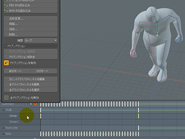 この時、トラックビューで歩くアクションを開いてみると、2つのドライバチャンネルが存在しているのがわかります。それぞれに対してチャンネルが存在していますので、独立して編集することが可能です。