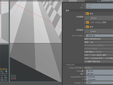 次に右側のカメラに対して、2D的に位置を移動します。2D的に位置を移動するには、カメラタブのフィルムオフセットの値を調整します。3Dカメラと違い、視点からパースがつくのではなく、既にパースが付いているカメラからの絵に対して移動するような形になります。