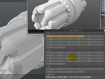 このスムージンググループを管理するパネルでは、設定したスムージンググループの選択なども簡単にできます。すべてのポリゴンの選択を解除すると、このモデルに対して設定されているスムージンググループの箇所でオレンジ色で表示されます。Altキーを押すとラベルに選択の文字が追加されるようになり、ボタンをクリックするとそのスムージンググループに属するポリゴンが選択されるようになります。さらにShiftキーを押すと、追加選択が可能ですし、Ctrlキーを押すと選択の解除が可能です。大文字小文字のアルファベット+数字のボタンが用意されているため、このパネルで設定可能なスムージンググループは計62個になり、細かくグループ分けを行うことができます。