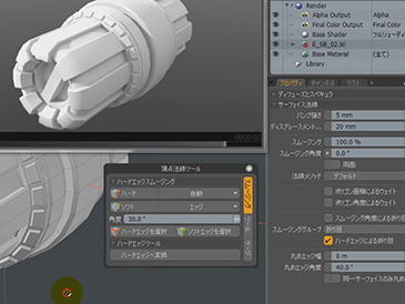 このオプションをオフにし、ハードエッジによる折り目オプションをオンにしてみます。そうすると全体にスムージングがかかったような状態になります。これはまだハードエッジが定義され地ないため、ハードエッジによる折り目が全く存在せず、全てにスムージングがかかっているためです。まずはハードボタンをクリックし、ハードエッジを定義します。リストタブ > その他を見てみると、Hard Edgeというマップが作成されたのがわかります。ソフトボタン横のポップアップから角度を選択し、次に角度を30といれてソフトボタンをクリックしてみます。そうすると、スムージング角度が30度の時と同じような挙動でソフトエッジが設定できました。さらに、ポップアップからエッジを選択し、スムージングをかけたいエッジを選択してソフトボタンを押すと、こちらもスムージングがかかるようになります。ハードエッジを選択ソフトエッジを選択ボタンをクリックすれば、どこにそれぞれのエッジが存在しているのかをひと目で確認できるようになります。