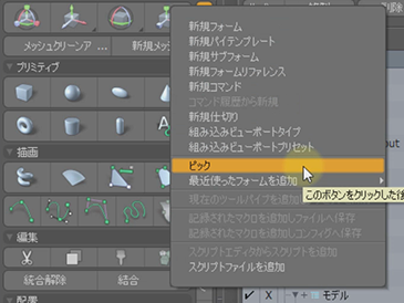 次にコピーしたいアイコンがあるレイアウトへと切り替えます。今回の場合、Modoレイアウトへと切り替えます。フォーム編集左上にある作成のドロップダウンからピックというメニューを選択します。このメニューを選択した状態でマウスでクリックしたアイコンが、新規コントロールとして追加されるようになります。ピックを選択している状態でステッチメッシュを選択すると、フォーム編集のサブフォームの中にステッチメッシュが追加されました。連続してアイコンを追加していきたい場合には、ピックメニューを選択し、Shiftキーを押しながらアイコンをクリックしていきます。