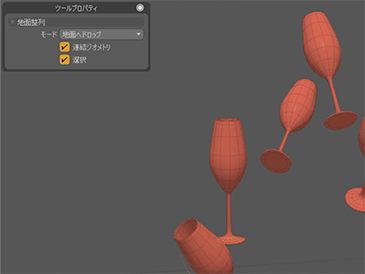 このツールは複数選択していても正しく動作します。また作業平面にも対応しています。例えば床のメッシュに対して作業平面を設定し、ワイングラスの底のポリゴンを複数選択して、右クリックさらに左クリックで、全てのワイングラスを一気に整列させることができます。こうすることで、ワールド座標におけるY=0の位置でない斜めの平面に対しても、簡単に整列させることができます。