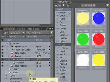 まずはサンプルとなるメッシュに対して、マテリアルのプリセットを適用してみましょう。バージョン12.2までは、マテリアルのプリセットをビューポート上の目当てのマテリアルの上、もしくはシェーダツリーのマテリアルの上へとドラッグアンドドロップすると、プリセットに登録されていたマテリアルの設定が読み込まれ、適用先のマテリアルへとコピーされた状態となっています。このため、リンク元となるプリセットを修正したとしても、その変更が反映されることはありませんでした。