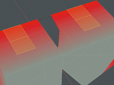 こちらのウェイトマップを右側のひねりを加えた立方体へと移してみます。転送元となる左側の立方体を選択した後に、転送先となる右側の立方体を複数選択し、ポリゴンモードへと切り替えたら、それぞれのメッシュから対応する隣り合う2つのポリゴン、つまり計4枚のポリゴンを選択します。