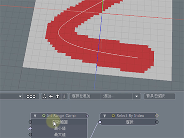 この選択範囲をスケマティックへと追加します。スケマティックにはこの整数範囲を指定するためのノードが用意されています。スケマティックビュー > 追加 > 整数範囲 > Int Range Clampを追加し、このノードの出力をSelect By Indexの選択へと接続します。Int Range Clampの整数範囲を0-100に設定し、最小値の値を変えてみると、カーブが伸びるような動きになるのがわかります。