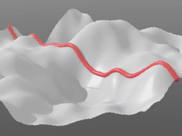 サンプルとなるシーンには、緩やかに形状が変化するメッシュが用意されています。このメッシュの断面をカーブの形状にそのまま移しだしてみます。まずはカーブを用意しましょう。この形状は1メートル四方で作られていますので、カーブもそれに合わせて作成します。