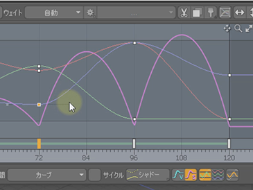 これに対して速度表示モードの場合、ある一つのチャンネル内における変化の緩急具合ですので、複数のチャンネルを表示しているときには表示されません。チャンネルがひとつだけ選択されている場合に、表示されるようになります。これは値の変化に対する緩急具合ですので、位置だけに限らず、回転チャンネル、さらにはトランスフォームのチャンネルではないモーフのチャンネルなどでも表示させることが可能です。