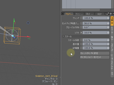 さらに面白い機能としてスケール機能があります。従来であれば、ゴールアイテムが離れたら、スケルトンは本来のサイズを超えてゴールに追従することはありませんが、スケール係数を100%に設定すると、2本のスケルトンはゴールアイテムの位置にかならず一致するよう、自身の大きさを変化させます。基本量が0%の場合は2本目のスケルトンが、逆に終端量が0%の場合は1本めのスケルトンのみがスケールを変えることになります。