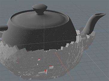 複製元となる立方体を一つ作成し、リプリケータも作成します。さらに複製を行う際のポイントソースとなるSurface Particle Generatorも追加しておきます。これは指定したメッシュの表面に対して点群となるポイントソースを生成するアイテムですので、ソースサーフェイスとしてティーポットを指定しておきます。リプリケータの原型となるアイテムを作成した立方体、ポイントソースをSurface Particle Generatorに設定すると、ティーポットの表面に満遍なく立方体が配置されたのが確認できます。配置具合については、Surface Particle Generatorの平均間隔の値で調整することができますが、表面に一様にポイントソースが存在しているのがわかります。この配置をプロシージャルモデリングで作成した頂点マップでコントロールします。