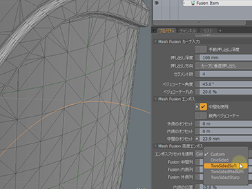 このエンボス具合に関しては、そのすぐ下にあるMesh Fusion 高度エンボスというカテゴリの中のエンボスプリセットを適用から、形状を選択することができます。デフォルトではCustomになっていますが、TwoSidedSoftに変更すると、外側から中間、中間から内側に関しての凹凸具合が非常に緩やかに変化していくようになります。サーフェイスストリップ絶対幅と共に調整することで、より滑らかな変化を表現できるようになります。