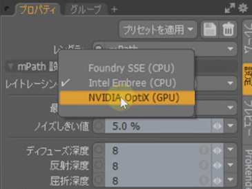 レンダラーからmPathを選択してみると、そのすぐ下にレイトレーシングエンジンを選択するポップアップが出てきます。ポップアップを見てみると、Foundry SSE (CPU)とIntel Embree (CPU)、それにNVIDIA Optix (GPU)の三つがリストされているのが確認できます。14.1より前のバージョンまではFoundry SSEとNVIDIA OptiXの二つだったのが、14.1からは新たにIntel Embree (CPU)という選択肢が増えています。