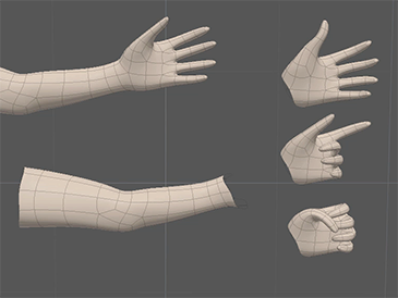 まずは二つのメッシュ間での頂点インデックスの同期について解説します。このサンプルシーンには、元となる腕の形状と、そこから複製した腕のベース、そして表情をそれぞれ変えた手首のメッシュが用意されています。この腕のベースと手首のメッシュは、元となる形状を複製し、分割して作成されたものです。こうやってパーツを分けることで、様々な組み合わせを作ることができますし、ライブラリ化も可能になります。今回はサンプルとして腕だけを例にとっていますが、キャラクタの様々なパーツに対してこのように分けて管理するケースがあるかと思います。