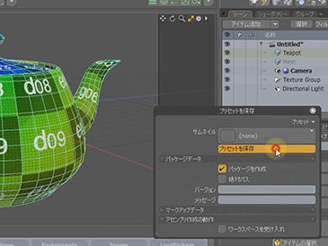 サンプルとしてティーポットを作ってみます。マテリアルを作成し、標準コンテンツの中からUVの画像を適用してみましょう。従来だとこの状態でプリセットを保存すると、画像は張られた状態で保存はされますが、画像そのものを保存するわけではないので、例えば他のマシンに持っていった場合に、同じ場所にマッピングした画像が存在しなければ、画像が欠けた状態で読み込まれることになります。