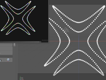 Array Generatorの矢印のアイコンをクリックし、Primitive Generatorへと置き換えます。複製エフェクタ元の形状を置き換えるオプションをオンにすると、プリミティブジェネレータで指定するプリミティブの形状に従って、星が複製されるようになります。さらにプリミティブジェネレータのタイププリセットにし、ツールパイプとしてContent Presetを追加してみます。Content Presetから指定したカーブの形状に従って、簡単に複製が行えるようになります。シェイプの形状は、好きなカーブを登録することができますので、オリジナルのカーブ形状に沿って複製したり、またそれを後から何度でも使ったり、複製すると同時にそのプロファイルで押し出しなどの他のモデリング処理も行うなど、様々な表現が可能になります。