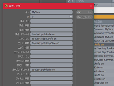 あとはエッジが選択されていない時にはエッジスライスツールを起動したいので、エッジ:なしに対してエッジスライスツール、エッジが1本選択されているときにはループスライスツールを起動したいので、エッジ:単数に対してループスライスツールの起動コマンドを入力します。OKボタンをクリックしたら、実際に動作を確認してみましょう。現在、フォーム編集のMySliceボタンには設定パネルを開くために、条件コマンドの前に?マークがついていますが、この?マークを削除します。こうすることでMySliceの設定パネルを開くのではなく、MySliceのキーが設定された条件コマンドを実際に実行するという意味を持つようになります。