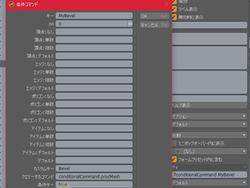 同様に、もう一度MyBevelボタンをクリックし、設定パネルから先ほどと同じくカスタムキーに Bevel、クエリーするコマンドとして conditionalCommand.procMesh を設定したら、今度は条件キーに false と指定します。false とすると、プロシージャルモデリングのメッシュではない場合、つまりダイレクトモデリングのメッシュの場合ということになりますので、条件アクションにダイレクトモデリング用のベベルの条件コマンドである conditionalCommand DirectBevel を設定してOKボタンを押します。フォーム編集のコマンドからは先頭の ? を削除しておきます。