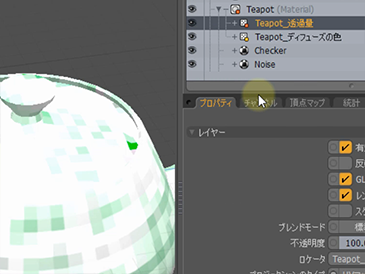 例えば、サンプルとしてティーポットのモデルを作成し、マテリアルを作成します。このモデルにプロシージャルのテクスチャを設定してみましょう。シェーダツリーのレイヤー追加 > テクスチャからGridを適用してみます。さらに、Noiseテクスチャも重ねてみましょう。通常であれば、プロシージャルのテクスチャはビューポート上では確認できません。どのように適用されているのかを確認するには、プレビューウィンドウを出すしかなく、ビューポート上で確認するためには、RayGLを使うかテクスチャへとベイクする必要がありました。RayGLを使っても良いのですが、RayGLの場合はプレビュー機能とビュー機能を合成していますので、レンダリングの負荷が高いシーンになると、手軽さに欠けてくる傾向があります。