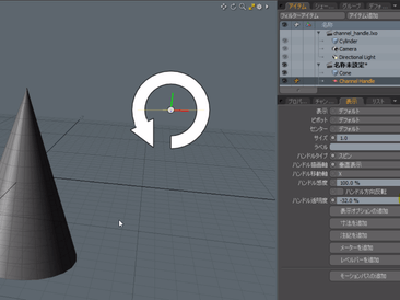 チャンネルハンドルはビューポート上でマウスを上に重ねると、ハイライト状態になりますので、ハイライトの状態でチャンネルハンドルをクリックアンドドラックすると円錐の回転Zの値が変更され、円錐が回転するようになります。