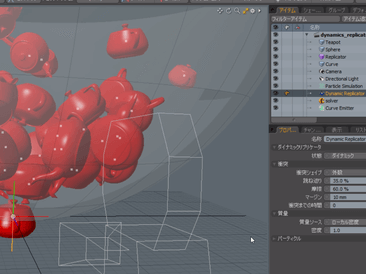 これをティーポットの形状に合わせて積み上げるには、リプリケータを選択し、ダイナミクスのタブからアクティブリジッドボディを適用するだけです。シミュレーションしてみると、ティーポットの形状に合わせて積み上げられるようになります。アイテムリストを見てみると、新たにDynamic Replicatorという新たなアイテムが追加されているのが確認できます。これがリプリケータでダイナミクスを行えるようにするためにMODO 801から搭載された新たな機能です。