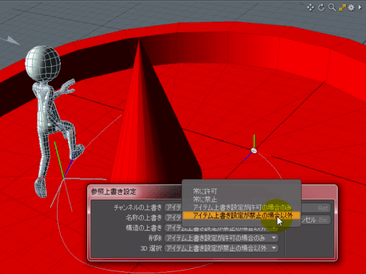 現在読み込んでいる参照上で右クリックしコンテキストメニューを出すと、参照というメニューが用意されています。一番上にある参照上書きを編集を見てみると、チャンネル/名称/構造/削除/選択に関する上書き、つまりこのシーン内で読み込んだ参照シーンを編集可能にするかどうかという設定が行えるようになります。例えば、チャンネルの上書きのポップアップを見てみると、常に許可/常に禁止/アイテム上書き設定が許可の場合のみ/アイテム上書き設定が禁止の場合以外という4種類のオプションが用意されています。
