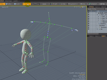 接続が完了したら、セットアップモードを抜けて再生してみます。キャラクタがBVHで読み込んだ動きに合わせて、動くようになりました。後で同じようなBVHファイルに対応させたいときのために、セットアップモードへと戻り、マッピングファイルを保存ボタンをクリックし、ソースとターゲットの対応付けをファイルとして保存しておきましょう。この保存したマップファイルは、別のBVHを適用する際に読み込めば、ひとつひとつソースとターゲットを接続させる作業を省略することができます。
