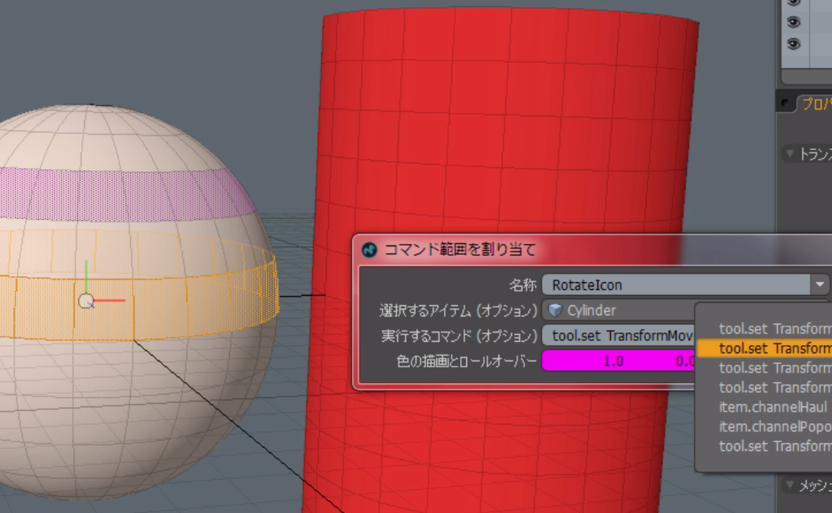 まずはボールのポリゴンを選択します。次にコマンド範囲サブタブにあるコマンド範囲を割り当てボタンをクリックします。するとこのコマンド範囲を定義するパネルが現れますので、最初に名称を定義しておきます。次に円柱を選択して移動ツールを起動しますので、選択するアイテムに円柱を、また実行するコマンドに移動ツールを起動するコマンドを選択します。このコマンドにはあらかじめいくつかコマンドが用意されていますが、それ以外のコマンドも手動で入力することも可能です。また、わかりやすくするためコマンド範囲にはそれぞれ違う色を設定することも可能です。設定を終えたらOKボタンをクリックします。