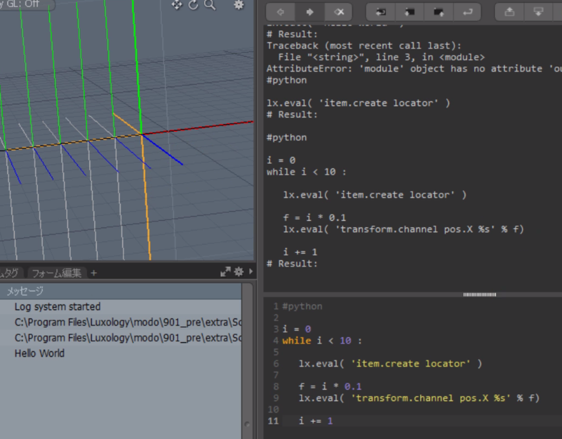 今まではコーディングの時には他のエディタや環境で作成し、MODOに読み込んでテストするという流れを繰り返していたかと思いますが、MODO 901からは一つのタブの中でそれらのまとめて行えるようになったことで、非常にスムーズな作業が可能になりました。