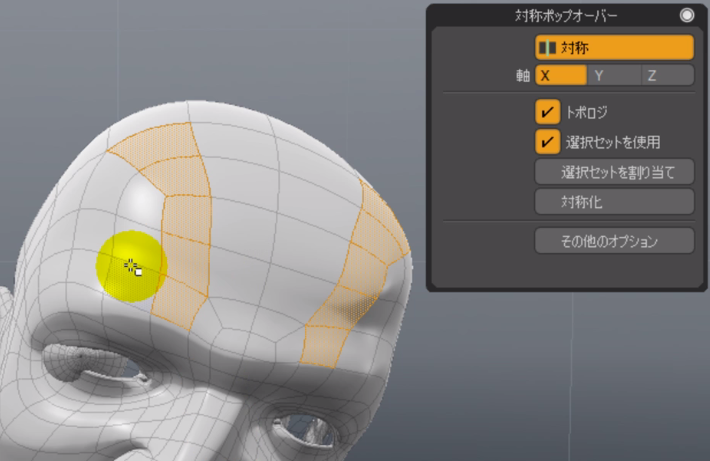エッジモードへと切り替え、今回の場合の軸となるエッジの流れを選択し、選択セットを割り当てボタンで対応する軸を指定して設定を行います。そうすると、選択セットを使用ボタンをオフにしておけば、指定したエッジの流れに対して対称となるエレメントを選択できるようになります。