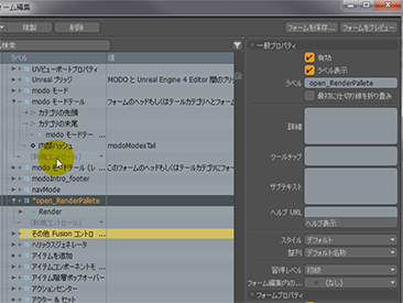 また、ショートカットキーではなく、インターフェイス上のボタンとして常に配置しておきたいという場合もあるかと思います。そういった場合には、まずインターフェイス上にボタンを作成します。アニメーションレイアウト以外、どのレイアウトでも共通して表示されているのが、トップに表示されているUnrealブリッジのアイコンなどがあるツールバーです。このツールバーの端っこに一つ新たにボタンを作りましょう。フォーム編集を開き、フォーム検索ボタンでツールバーをクリックします。このツールバーはmodo モードツールバーであることがわかります。+ボタンをクリックし、カテゴリの末尾を開くと、さらにmodoモードテールというツールバーにつながっているのがわかります。フォームの中からmodoモードテールを開いておきましょう。