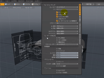モデルが視点に対しBackdrop Itemよりも向こう側に存在する場合、Backdrop Itemの透明度にある程度の値を設定していても、透けて見えるはずのモデルが見えない場合があります。こういった場合には、ショートカットキーOで表示とコントロールタブにあるオーバーレイ表示をオンにしてください。