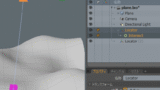 ではシェーダツリーからレイヤーマスクの画像を選択します。テクスチャロケータタブからプロジェクションタイプを見てみると、デフォルトではUVマップになっています。ここをフロントプロジェクションへと変更し、プロジェクションカメラのポップアップから先程追加したProjectionCameraを設定します。3DビューでProjectionCameraからのビューへと切り替えます。ここで見えているビューに対して、テクスチャが適用されていることになりますので、カメラを調整してテクスチャの映り込み具合を変更してみます。カメラを移動させると、その分、投影されるテクスチャの位置も変わっていきますので、カメラアニメーションによりテクスチャのアニメーションが可能になります。