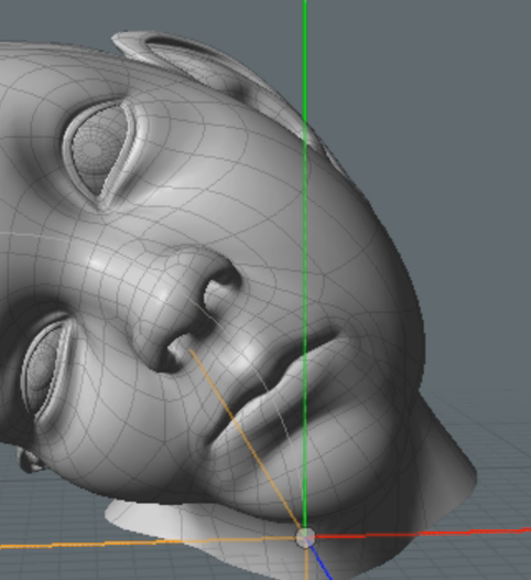例えば、キャラクタアニメーションなど、キャラクタのメッシュがスケルトンで動き、さらに顔の表情をモーフで動かすといった複数のメッシュの変形を行うケースが多々あります。サンプルとなるシーンには顔のメッシュに対して、あらかじめ目を閉じるモーフマップを用意しています。まずは顔のメッシュ全体に対して変形を施してみます。