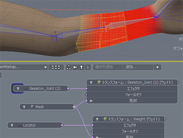 スケルトンをスケマティックビューへと追加し、接続を確認してみます。そうするとスケルトンはインフルエンスと呼ばれるノードに接続されているのがわかります。このインフルエンスは、メッシュが変形する際に「どのアイテムによって変形がコントロールされるのか」「どのメッシュに対して、またメッシュのどこに対して変形を行うのか」といった詳細をコントロールするためのものです。スケルトンとメッシュをバインドすると、自動的にスケルトンに対して対応するインフルエンスが生成され、変形をコントロールするようになります。