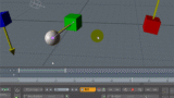 簡単なシーンで解説しましょう。このサンプルシーンでは青のボックスが親、赤い球体が子に設定されており、子は親から少し離れた場所に配置されています。親子関係が設定されている場合、親のアイテムを動かすと、子のアイテムも相対的な位置関係を保ちつつ、移動に追従します。回転やスケールも同様です。子のアイテムは親のアイテムの影響を受けるようになります。