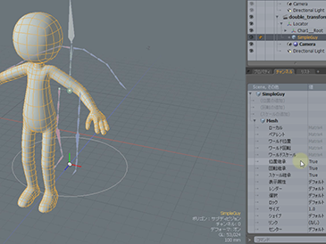 では先ほどのキャラクタのシーンへと戻ってみます。キャラクタのシーンではルートとなるロケータの動きを、スケルトン階層とキャラクタモデル、双方が影響を受けることが原因でした。キャラクタモデルがロケータのトランスフォームの影響を受けることなれば、スケルトン階層の動きだけをもとに、キャラクタモデルが変形するようになるので、正しい動きとなるはずです。このため、キャラクタモデルを選択し、位置や回転、スケール継承をFalseへと設定すると、ダブルトランスフォームの問題は解消され、正しい変形とトランスフォームが行われるようになります。