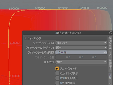 この状態で、頂点マップエッジウェイトツールを起動し、ビューポートをクリックすると、そのエッジウェイトによって、エッジの丸み具合が変化します。この時、各エッジに適用されるウェイト値を表示させたい場合には、ウェイト表示オプションをオンにします。