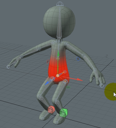 セットアップモードを抜けて確認してみましょう。ゴールアイテムを選択しWキーで移動ツールをオンにして移動させてみると、自由に足を動かすことができるようになります。同様の手順でもう片方の足の階層にもIKを組み込んだら、腰のところにあるルートスケルトンを動かしてみましょう。そうすると、キャラクタ全体が動きますが、両足のゴールの箇所で固定されるため、自動的にIKによりひざを折ってしゃがむようなポーズを作ることができます。