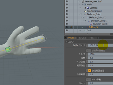 ではここからFKに切り替えてみます。アイテムリストでスケルトンの階層を開いてみると、FullBodyIKというロケータがあります。これがインバースキネマティクスの動きをコントロールするアイテムとなります。インバースキネマティクスのタブを見てみると、IK/FKブレンドというプロパティがあります。この値が100%のときにはIK、0%のときにはFKとなります。