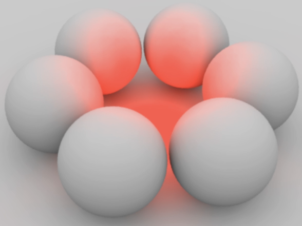 ライティング用のライトを放射するメッシュにするには、マテリアル(透過)タブにあるルミナンス輝度の値を上げます。これがライトを放射する強さになります。ルミナンス輝度の値を上げ、赤色に設定してみます。すると、床や球体に赤色のライトが影響を及ぼしているのが確認できます。