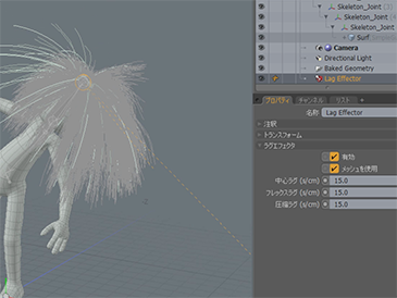 ではセットアップパレットのデフォーマタブからラグデフォーマを適用します。デフォーマを適用したら、ラグエフェクタタブにある、中心ラグやフレックスラグに値を入れ、アニメーションを再生してみましょう。そうすると、動きに合わせてファーが揺らいでいるのがわかるかと思います。